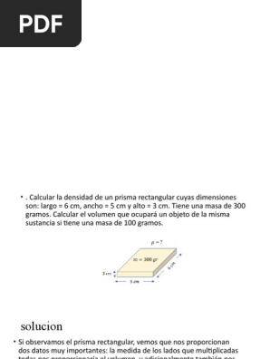 Densidad de un prisma rectangular. Largo 6 cm ancho 4 cm alto 2 cm y tiene una masa de 250 g calcular el volumen que ocupara un objeto de la misma sustancia si tiene una masa de. Largo 6cm ancho 5 cm alto 3 cm y tiene una masa de 300 g. Expresa tu resultado en el sistema cegesimal de.