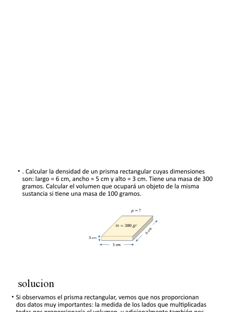 Calcular el volumen que ocupara el mismo cuerpo teniendo en cuenta una masa de 150 gramos. Calcular la densidad de un prisma rectangular cuya dimensiones son. Calcular el volumen que ocupará un objeto de la misma sustancia si tiene una masa de.