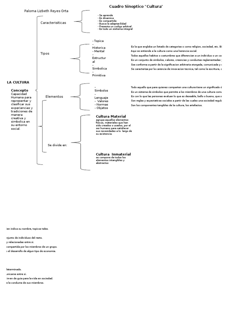 Cuadro Sinoptico Cultura Paloma Lizbeth Reyes Orta - Se aprende - Es dinamica - Es compartida Caracterisiticas - Busca la adaptavilidad - Presenta un codigo arbitral - Es todo un sisitema integral - Topica-Es la que engloba un listado de categorias o como religion sociedad etc. Bien indica su Historica - Mental Aqu se entiende a la cultura.