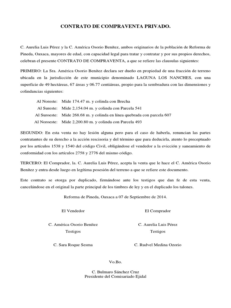 Formato De Contrato Privado De Compraventa De Terreno Ejidal