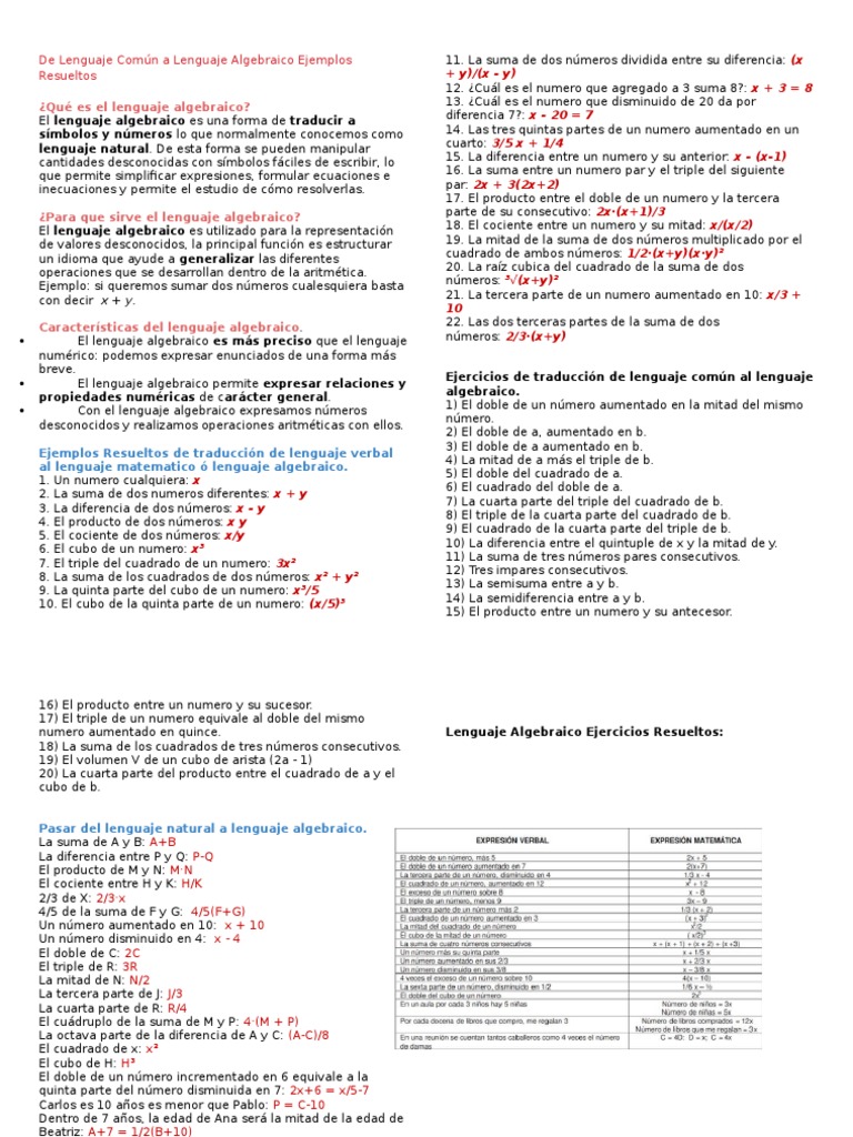 Ejercicios resueltos de lenguaje algebraico y lenguaje común El lenguaje algebraico nos permite expresar situaciones cotidianas en símbolos matemáticos esto para expresar. Ejercicios resueltos de lenguaje comun y lenguaje algebraico En el siguiente conjunto de ejercicios se presentan expresiones a pares que permiten contrastar entre una expresion y su.