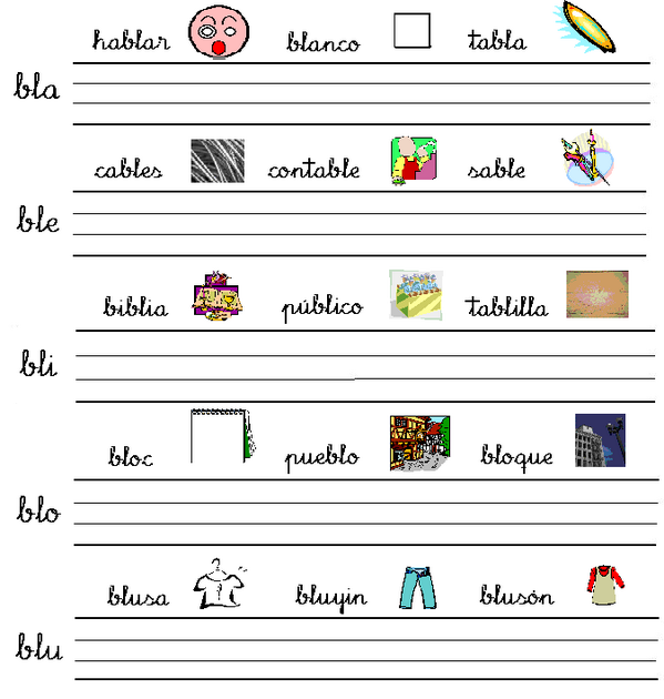 Palabras con ble bli blo blu. Ahora veamos más ejemplos de oraciones con bla. Ella usa un pantalón blanco. Con las silabas bla ble bli blo blu podemos formar palabras tales como.