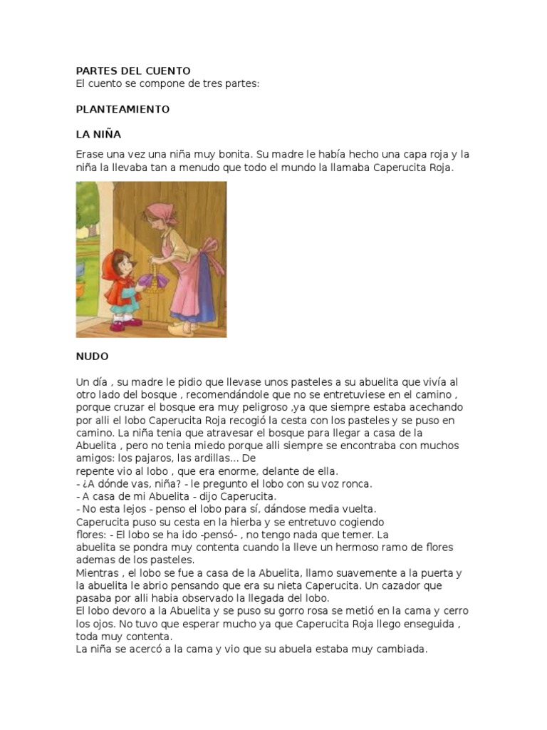 El cuento se compone de tres partes. Partes del cuento caperucita roja PLANTEAMIENTO Inicio La parte inicial de la historia donde se presenta a los personajes y sus propsitos.