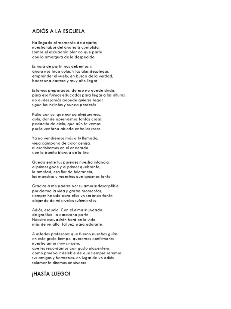 Despedida A Mi Escuela por Hersilia Ramos de Argote. Discriminado tanto a alumnos como a compañeros maestros tal veces inconscientemente hemos elegido a los mejores promedios de nuestras clases para participar en los diferentes eventos culturales o sociales ya que pensamos que ellos podrían hacer mejor el trabajo que los. DESPEDIDA A MI ESCUELA poesía coral para despedir a los alumnos de sexto grado Por el senderito blanco de mi vida llegué a tu morada.