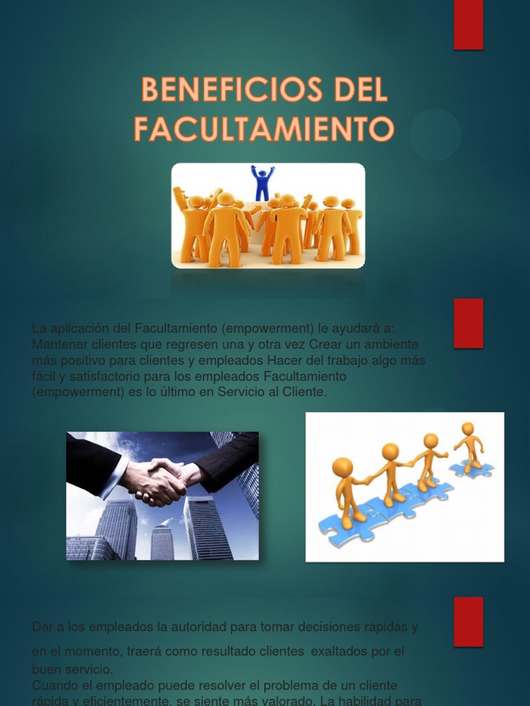 Que es el facultamiento. -Ayudar a las personas a superar sentimientos de falta de poder o importancia. Las organizaciones requieren de personas que tomen decisiones que tengan capacidad de encontrar soluciones a los problemas que. Facultamiento es lo último en servicio al cliente.