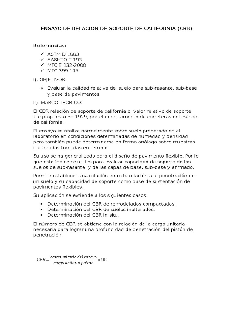 Este ensayo fue ideado por OJ. CALIFORNIA BEARING RATIO CBR VALOR RELATIVO DE SOPORTE VRS 1. VALOR RELATIVO DE SOPORTE El valor relativo de soporte fue desarrollado en 1925 en California por lo que también se le conoce como California Bearing Ratio CBR o prueba Porter determinas las características de resistencia se un suelo la calidad de los materiales usados.